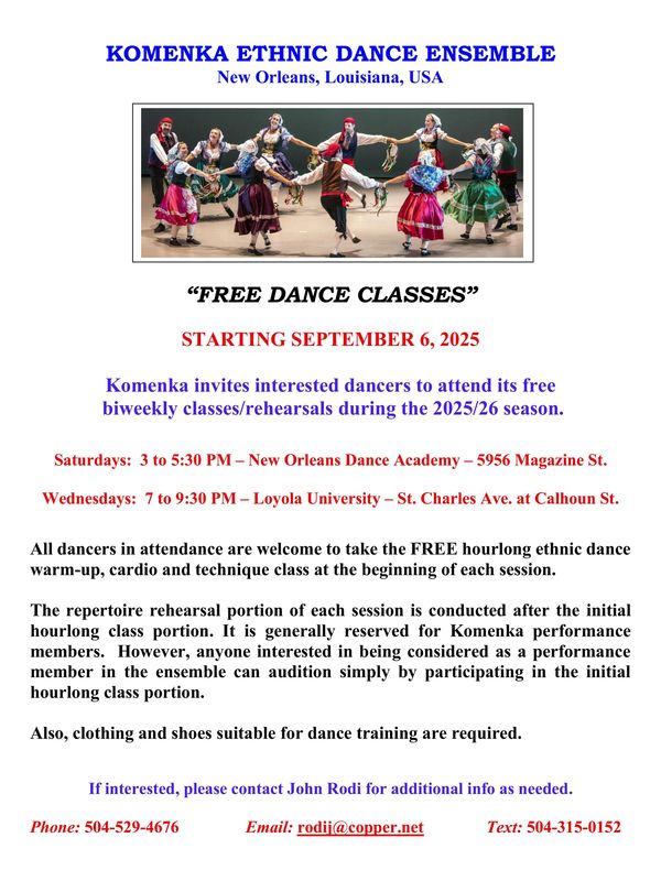 Komenka was established in 1979 as a New Orleans, Louisiana, USA non-profit arts organization with the purpose of portraying international folk cultures through dance and music. The forty-plus member ensemble includes professional and semi-professional artists from throughout the New Orleans community. Training with internationally recognized choreographers and musicians is highly stressed and reflected in program repertoire. Costumes are replicas or carefully designed adaptations of authenticated regional folk dress. The ensemble has been featured throughout the USA, and has performed on many television/radio stations. Komenka is very active in educational institutions of all levels. Komenka has often performed internationally since 1988 in areas such as Basque Country, Belgium, Bulgaria, Canada, the Caribbean, the Czech Republic, France, Germany, Hungary, Italy, the Netherlands, Poland, Portugal, Russia and Spain. Presented were such USA styles as Cajun, Appalachian, and New Orleans Jazz / Mardi Gras traditions. Komenka was the recipient of the first ever Big Easy Classical Arts Award for Best Ethnic Dance Presentation in 1993, and has received that prestigious award on numerous occasions since that time. Komenka was also the recipient of the prestigious Community Arts Award bestowed by the Arts Council of New Orleans in recognition of outstanding contribution to the arts of New Orleans for 30 years. Financial support for Komenka comes from performances, private donations, and public/corporate grants. Komenka is greatly indebted to Loyola University New Orleans and the New Orleans Dance Academy for their year-round provision of rehearsal facilities.